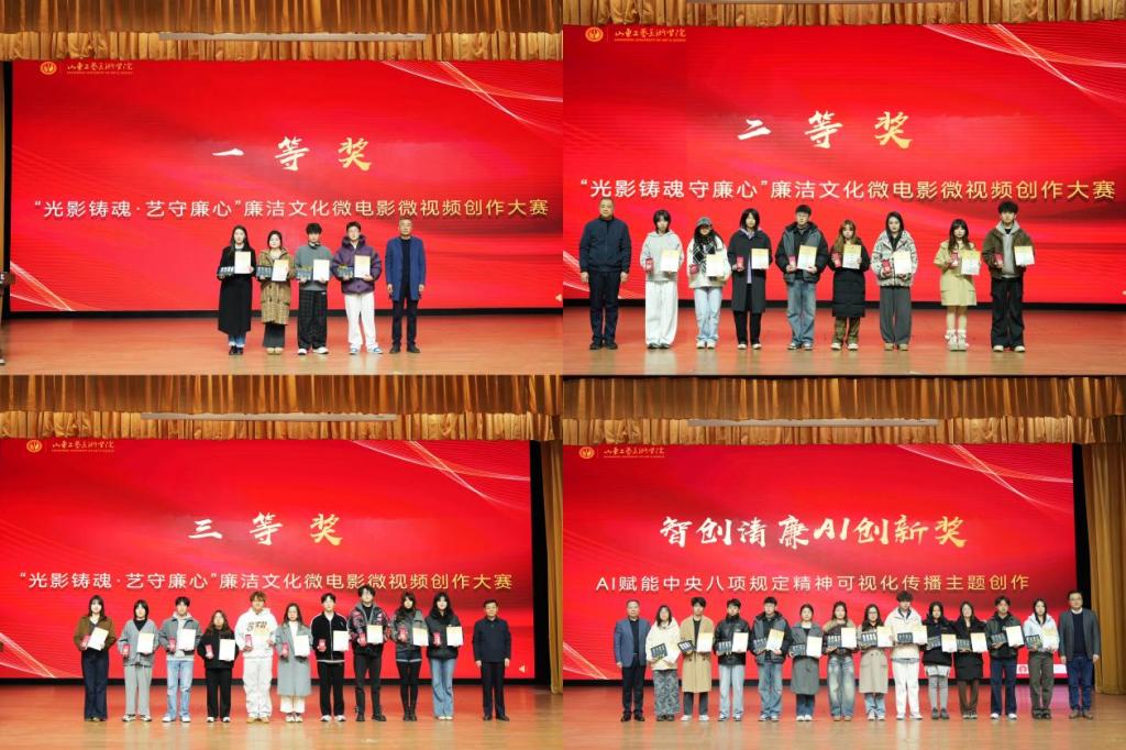 本次活动由校纪委、党委宣传部主办,数字艺术与传媒学院承办,旨在通过艺术形式传播廉洁理念,营造崇廉尚洁的校园文化氛围,表彰在学校“光影铸魂·艺守廉心”廉洁文化微电影微视频创作大赛和AI赋能中央八项规定精神可视化传播主题创作活动中涌现的优秀作品和获奖师生。活动共收到参赛作品百余件,经专家评审,最终评选出一等奖4项、二等奖8项、三等奖10项、“智创清廉AI创新奖”12项,共有205名学生和32名教师获得表彰。